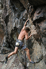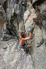 Алексей Целищев. ”Ashes to Ashes ”, 8а+ (первый мр-т, пробитый А.Целищевым на Треугольном). Озеро Треугольное, основной массив, сектор ”С”. Карелия. Июль 2004г. (Маршрут 15м, большая часть проходит по нависающему внешнему углу с мизерами). Вылез…Фото Веры Кучерявой. |