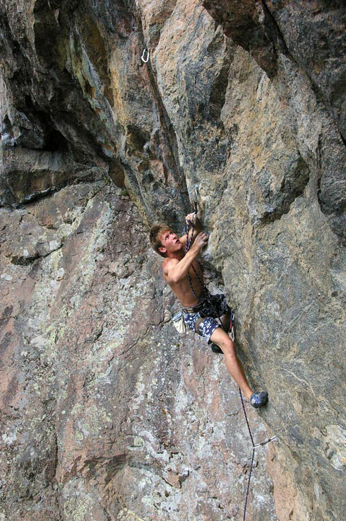 Алексей Целищев. ” Ashes to Ashes ”, 8а+ (первый мр-т, пробитый А.Целищевым на Треугольном). Озеро Треугольное, основной массив, сектор”С”. Карелия. Июль 2004г. (Маршрут 15м, большая часть проходит по нависающему внешнему углу с мизерами). Вылез…Фото Веры Кучерявой. |