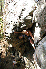 Константин Яэмурд. ”Karelian Istmus”, 7а. Озеро Треугольное, массив ”River Crag” (Новывй массив, найден в этом году. Первый из пробитых А.Ц. маршрутов на массиве. 19метров. Проходит по правой части нависающего внутреннего угла. Корпусное лазание, преимущественно щели и отколы. Есть возможность распереться и отпустить руки :). Карелия. Июль 2006г. Со второй попытки вылез… |