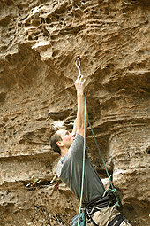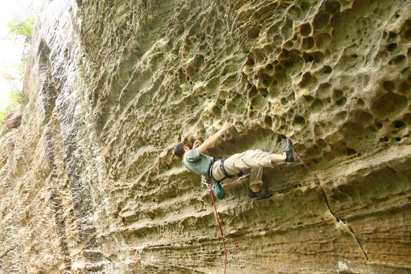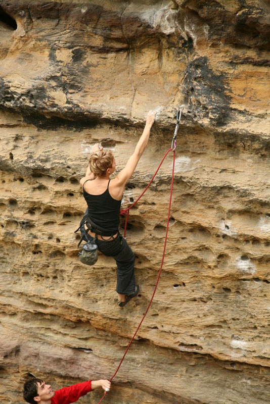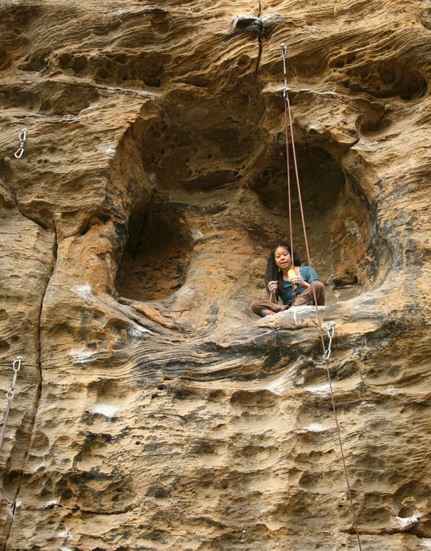 Разбалованный ДДС-ом организм «радовала» пробивка. На некоторых машрутах первый шлямбур на высоте 4-5 метров непростого лазанья, отягощенного парочкой камней под трассой. Вот видео (не наше) - ключ на Tuna Town - 7c. И уже через пару дней орудовали удочкой так же ловко как местные, при необходимости, вщелкивая оттяжку или веревку. У местных склолазов не возникает мысли не пользоваться удочкой, даже если подлаз под первый болт простой. Однако, данное поведение они компенсируют лазаньем до срыва.