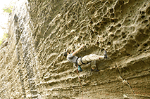 На второй день пошли в Боб Марли. Размялись на забавной трассе под названием Toker, 5.11a, 6c. Начинается тем, что забираешься на большой камень и прыгаешь через провал на большой джаг. Далее идет простое лазание по плитчатой вертикали и заканчивается внезапным нависанием по 'пчелиным сотам'.