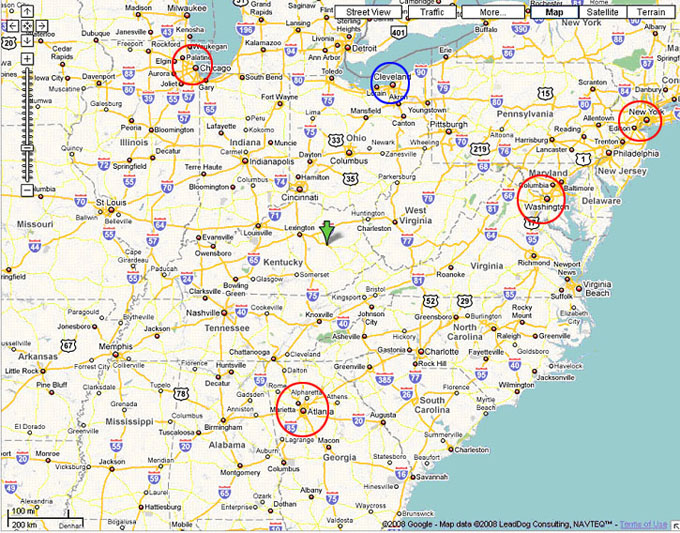 Примерные расстояния: Чикаго - 432 мили - 7 часов Вашингтон - 544 мили 9 часов Атланта - 413 миль 7 часов