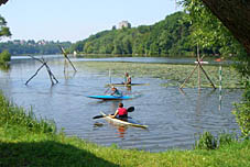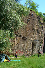 Поезд в Винницу стартовал в пятницу вечером в 19.08 и в 9.45 мы были на месте. Так как внятного описания, куда надо ехать, у нас не имелось (в предложенном на сайте ExtremeUa.com варианте на украинском языке разобраться не удалось), мы, закупив некоторые продукты на рынке у вокзала, сели на такси. Надо сказать, цены на рынке нас приятно поразили – 5 гривен (меньше 30 руб) за килограмм огромной отборной клубники). Таким образом мы доехали до спортивной базы «Динамо» и оттуда еще минут 7 шли до скал. Как оказалось, добираться туда можно очень просто - на любой маршрутке с вокзала до гостиницы Украина. Далее пешком мимо Горисполкома. У колодца повернуть направо и идти вдоль реки мимо базы Динамо. Метров через 300 за базой будет спасательная станция и сразу за ней слева – скалы. Маршрутка 36 доходит прямо до поворота на Динамо.