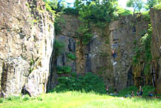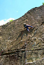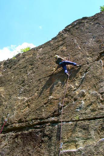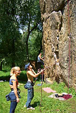 Местная порода – гранит. Скалы потому похожи на Карелию. Нависание практически отсутствует, кое-где в трассах есть сколы, в основном же сложность трассы зависит от величины полочек – крошечные полочки на сложных трассах, полочки побольше – на трассах полегче. Оборудованы трассы, на мой взгляд, вполне неплохо – шлямбура пробиты часто, ничего не болтается и не вываливается, ржавых шлямбуров нет. Только спусковые кольца и карабины почему то закреплены на одном шлямбуре.