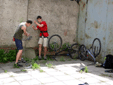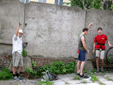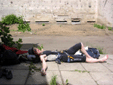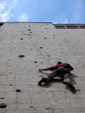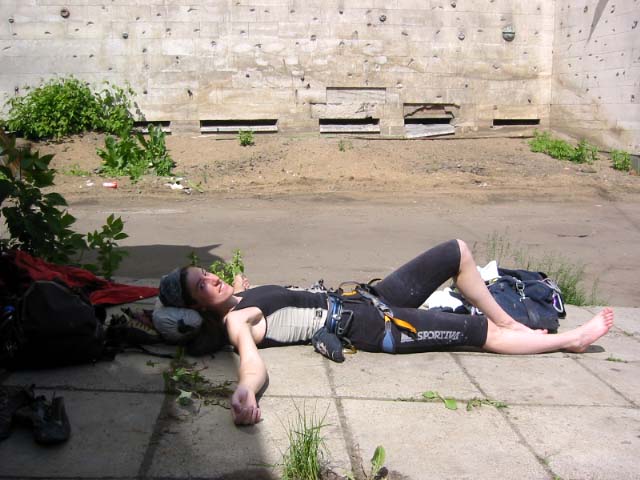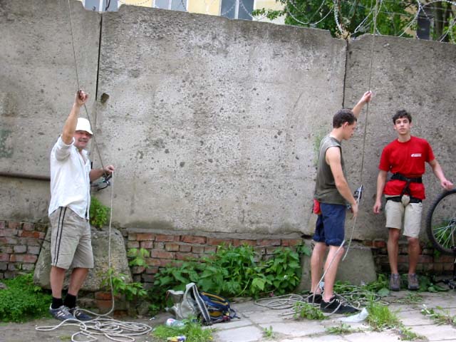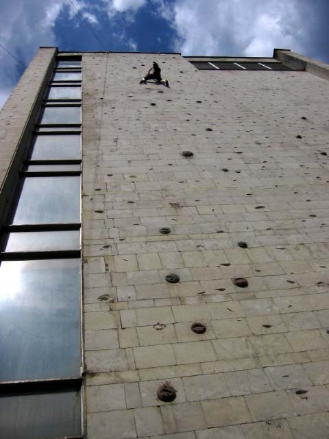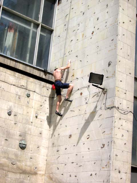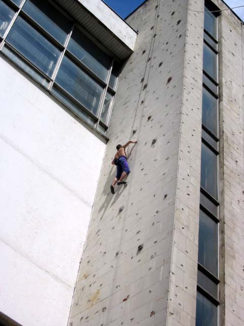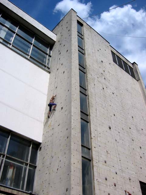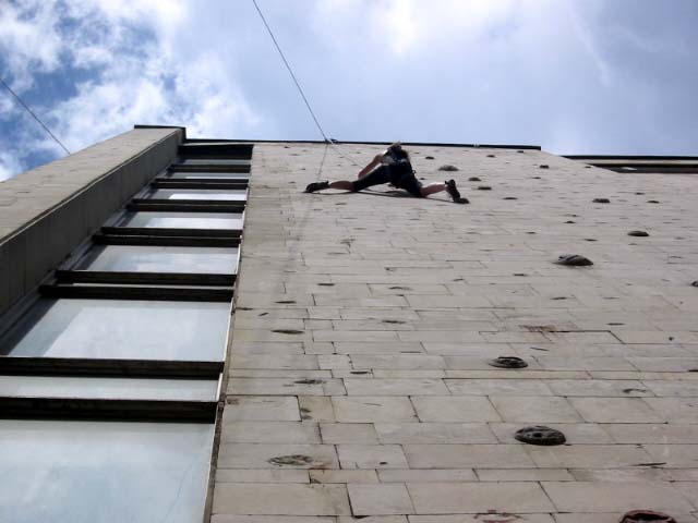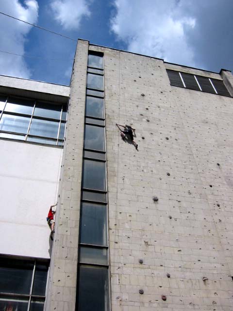 В эту субботу, как и в прочие погожие летние выходные, бауманская сборная тренировалась на внешней стене Бауманского спорткомплекса. Стена представляет собой маршруты длиной 27 метров и общей шириной метров пятнадцать. В обозримом будущем планируется нанести ограничители с тем, чтобы более четко обозначить маршруты. В основном зацепки это мизера, причудливым образом высверленные в камне, встречаются, однако и внешние хваталки. Сложность стенок варьируется от 6b и выше. Веревки провешиваются с крыши. Вид с 27-метровой высоты открывается потрясающий, слабонервных просьба выйти сразу. По ощущениям от лазания стена чем-то напоминает маршруты на Кошке. На данный момент свободный доступ на стену ограничен.