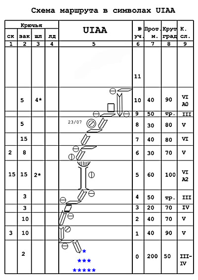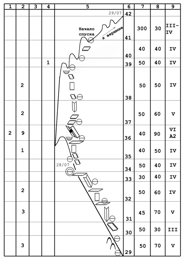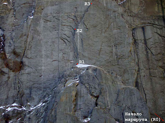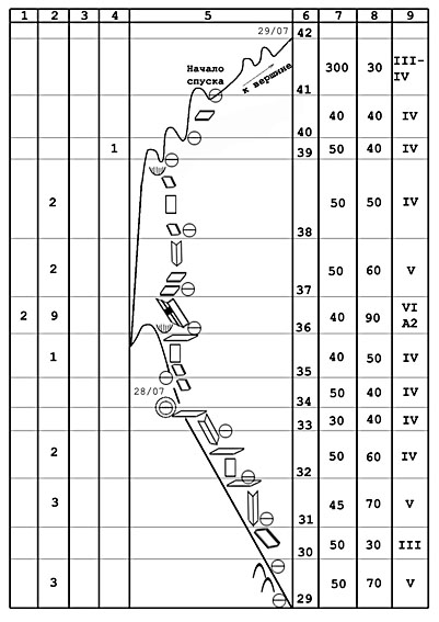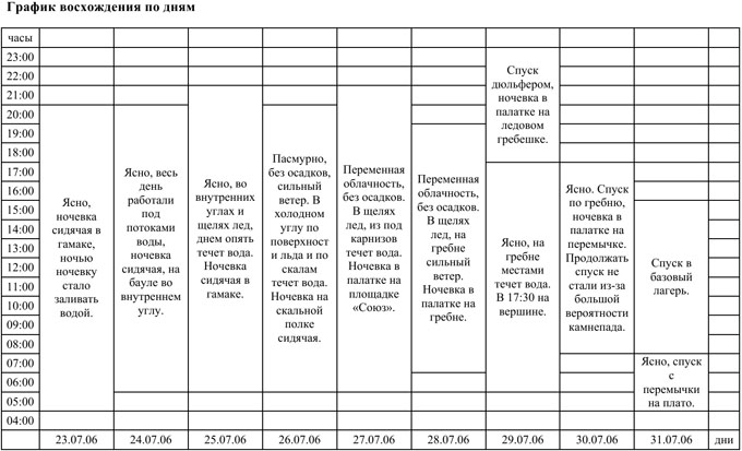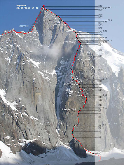Согласно ранее запланированному плану, на маршрут вышли 23-го июля в 5 утра. На стене работать начали с 8 утра. Маршрут обильно заливало водой со снежных пятен. Вода не замерзала по ночам. Часто приходилось работать под ее потоками. После 4 часов вечера потоки воды усиливались, так как стену начинало освещать солнце.