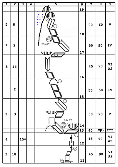 5-6: Широкий камин с натечным льдом, в верхней части огромная пробка-карниз «блин». Встречаются старые шлямбура, петли и крючья.