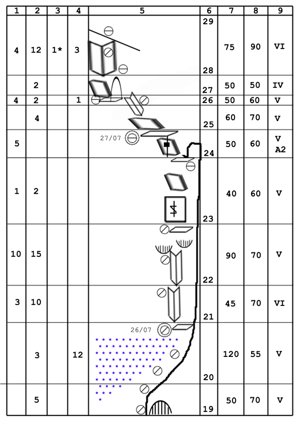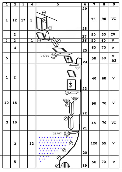 27-28: По крупноблочным скалам подойти под нависающий внутренний угол, с широкой щелью, залитый льдом.