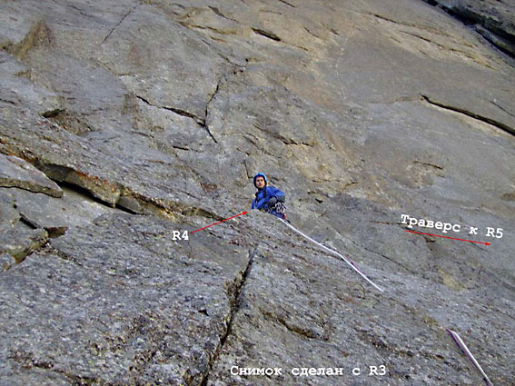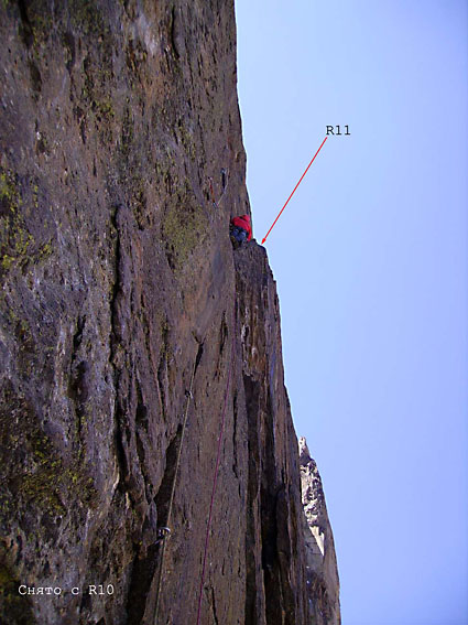 10-11: Сначала плита со шлямбурами, затем вправо во внутренний угол, выводящий на полку, которая является местом соединения маршрутов Першина, Ведерникова и Трощиненко.