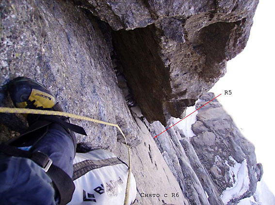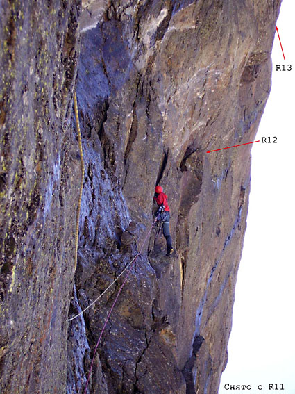 12-13: По плите вверх. Шлямбура, крючья, топорики. В некоторых местах шлямбура отсутствуют, либо сорваны уши. Хорошо идут скайхуки. Станция на полке с большим снежным пятном. На станции шлямбура старые, добавляли свои крючья.