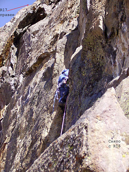 16-17: От откола влево вверх 5 м в основание вертикального внутреннего угла с глухой щелью. Есть дырка под съемный шлямбур. По углу вверх до полки.
