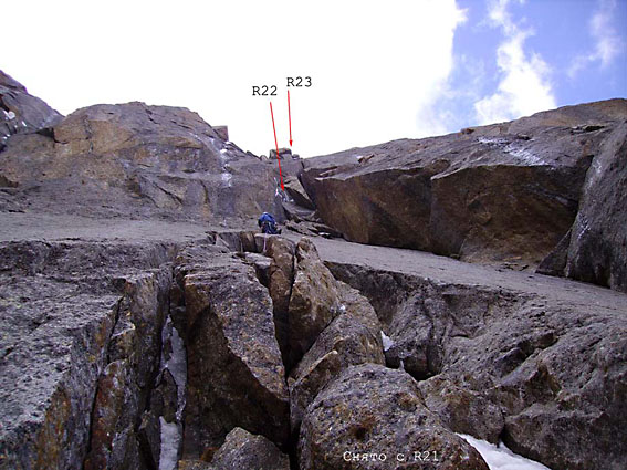 23-24: По плите с щелями, затем по разрушенным скалам на полку на гребне.