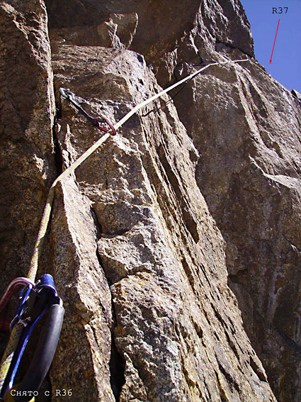 36-37: Обходя взлет гребня справа по косой щели выходим на полку справа от гребня.