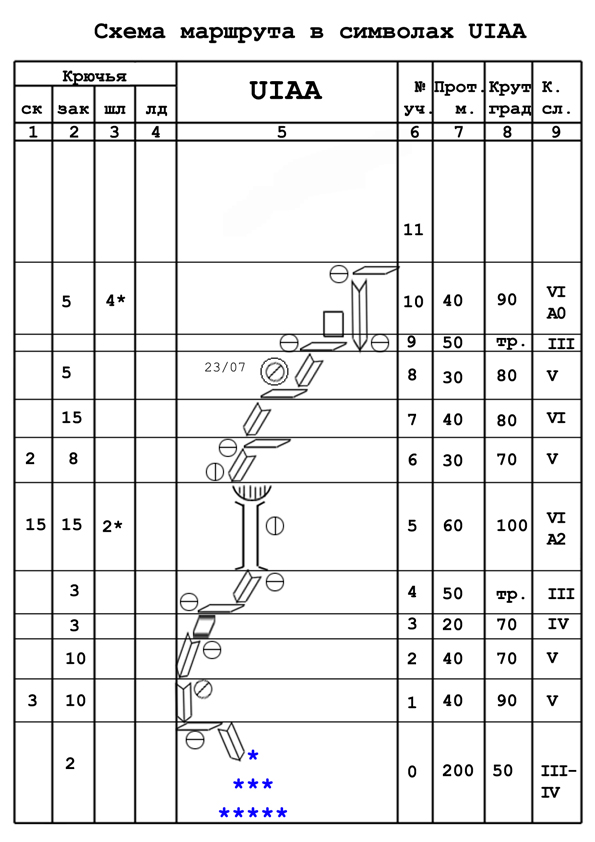 11-12: По плите вверх (дырки под скайхуки), затем шлямбур и лазанием в мульду, из нее вправо-вверх в сторону косой щели. В конце косой щели, на наклонной плите станция. На станции шлямбура старые, добавляли свои крючья.