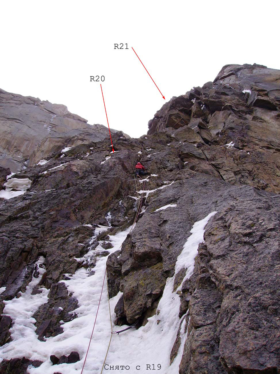 21-22: По внутреннему углу вверх. Щели забиты льдом. Возможно обойти справа по ребру.
