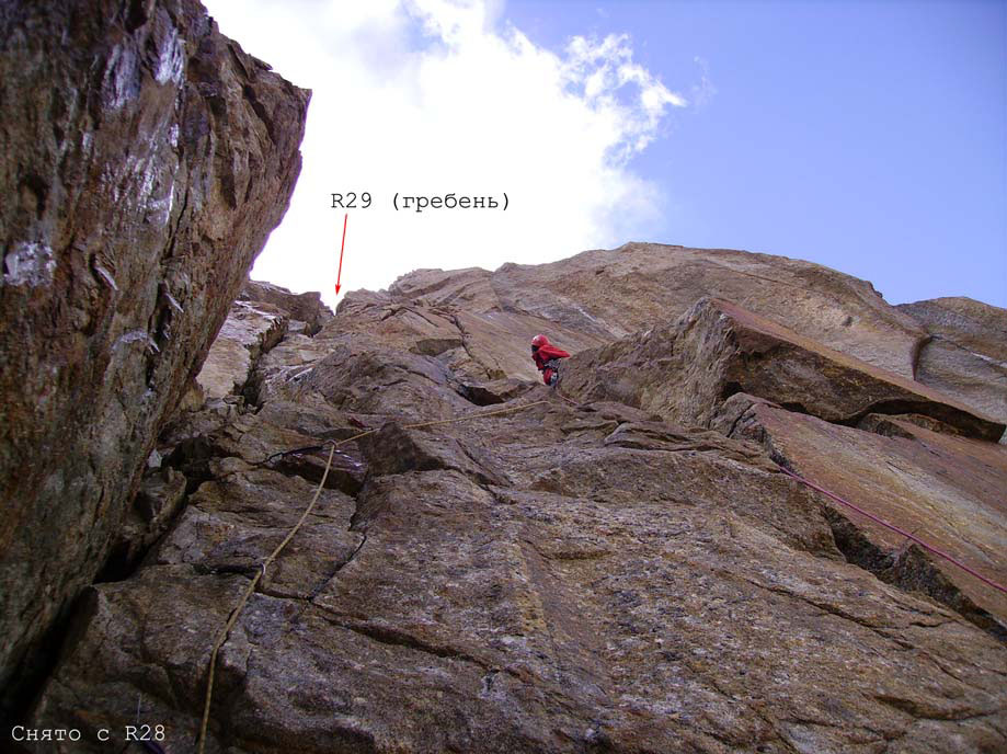 29-30: Вверх левее гребня по щелям и отколам с выходом на гребень.