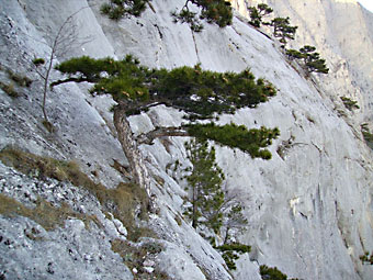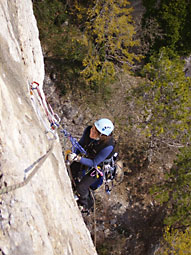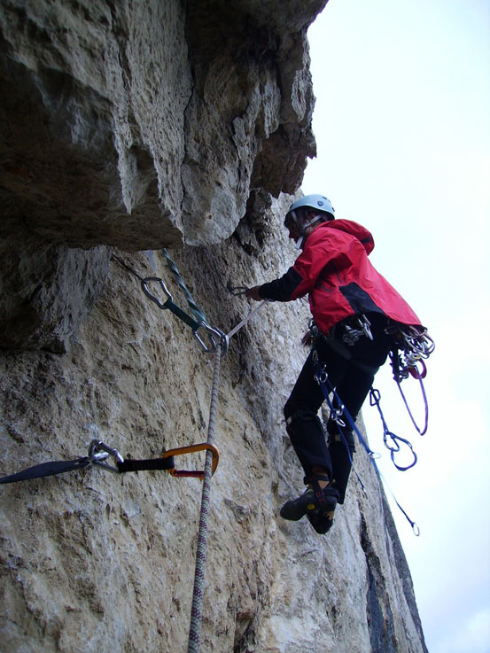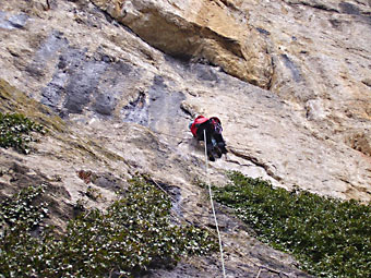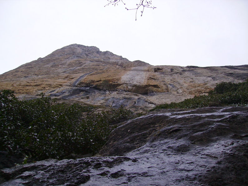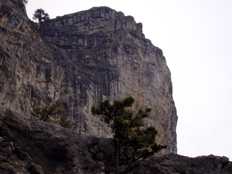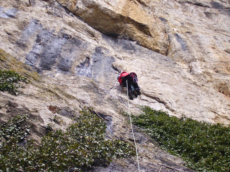 С утра льет обещанный дождь. К обеду должно распогодиться и мы идем под маршрут. Первая веревка мокроватая, а дальше – все сухо. Нависает. В 10 утра полезли. Внимательно слежу за движениями напарницы. Скользко. Вскоре я понял, что человек знает свое дело. Медленно, зато надежно. На первой веревке интересное лазание. Начало через вымоину с плющем, потом по плите с зацепками, затем откол, и пузо перед станцией. Частично ИТО, и много лазания. Станция под карнизом. Пока Маринка лезла, дождь перестал нас донимать и выглянуло солнце.