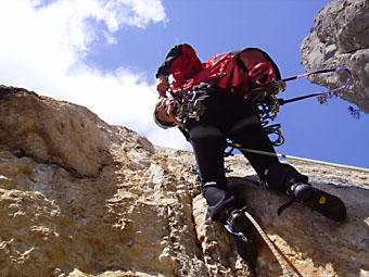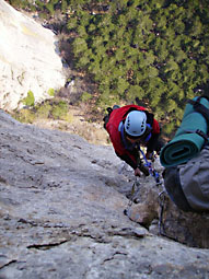 Время четыре. Нужно лезть шестую веревку. Уголок с лазанием и страховкой в щели. Потом карниз. В описании пишут – стремный. Подлезаю – ага, точно. Понаколотил крючьев и якорей. Кое как его перевалил. Дальше чуть попроще. Якоря, топоры – косая щель и нависает.