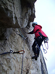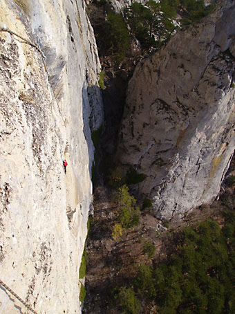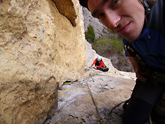 Четвертая и пятая веревки – не самые сложные, но, как мне показалось, самые прятные. Лазание по щели в углу 6b. Там где было сложнее – я ИТО-шил. Отличная натуральная страховка. Пока лез по углу, глянул в щель и чуть не выпал из нее. На меня уставилась толпа летучих мышей. А я руками в щели ищу зацепку получше. Как бы не цапнули. Маринка снизу кричит: «Вовка, они кусаются!». Так и лез. Гляну в щель чтоб никого не задеть и лезу. Писк, визг, крики... Зоопарк.