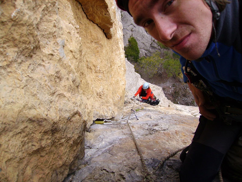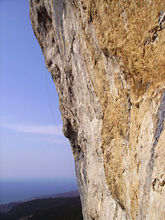 Сегодня точно отрываемся, потому что до полки по любому нужно вылезти. Полка находится после 5-ой веревки, над большим навесающим внутренним углом. Кроме того что она не очень удобная – мне о ней ничего не было известно.