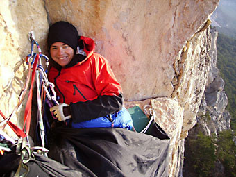 Перила прошли к 10 утра и я полез заканчивать третью веревку. Запомнилось – что в места, куда народ ставит скайхуки, я пихал пальцы и делал подлазы. Захватывающий подлаз перед станцией. Лазание 6b. Марина работает второй и выбивает мои железки. С этого момента я не переставал удивляться, с какой скоростью моя мега-напарница проходит веревку второй. Говорит: «Ваши крючьки, молодой человек, я вынимаю руками». Гм...