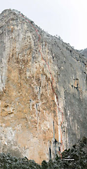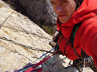 Восьмая веревка гораздо проще предыдущих. Пара скайхучных ходов, немного ИТО на закладках, дальше лазанием с кучей зависов (устал наверно), до карниза. От карниза ухожу вправо. Чуть не упал опять – забыл отщелкнуть самострах от петли. Кое как вернулся и отщелкнул. Потом лазание сильно упростилось, и я вылез к катушкам. Топоры и скайхуки предательски зацепились за штаны и я очередной раз чуть не упал. Пришлось затаив дыхание рукой нащупать проблему и отцепиться.