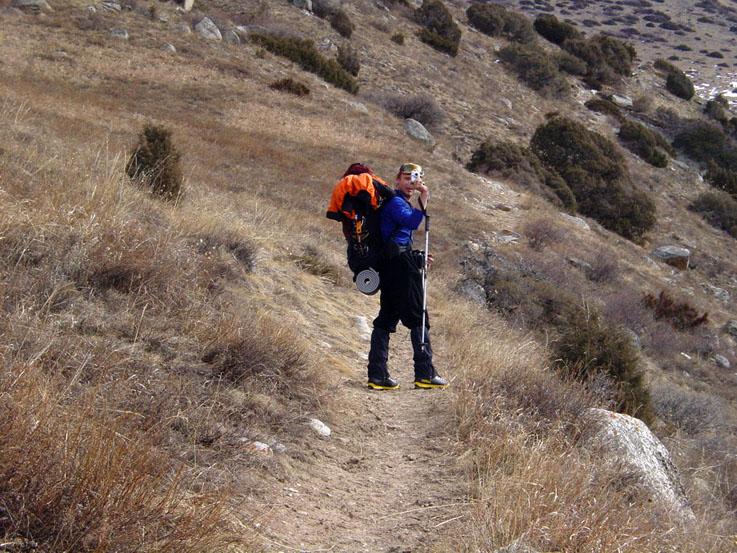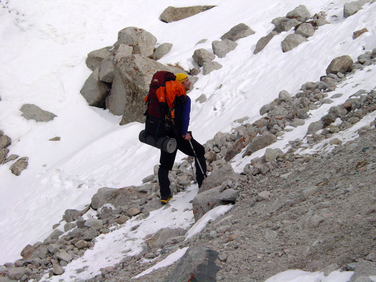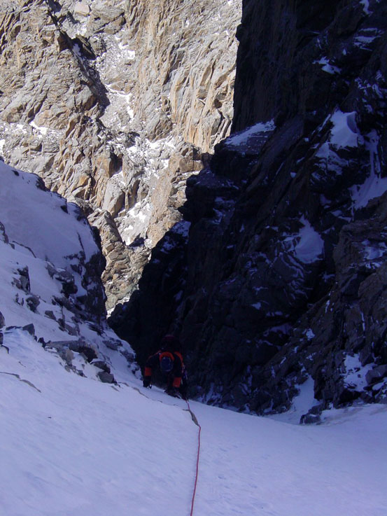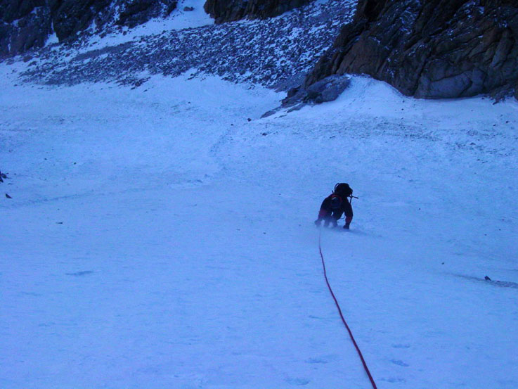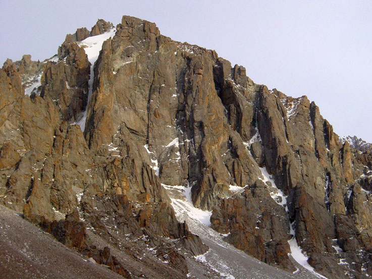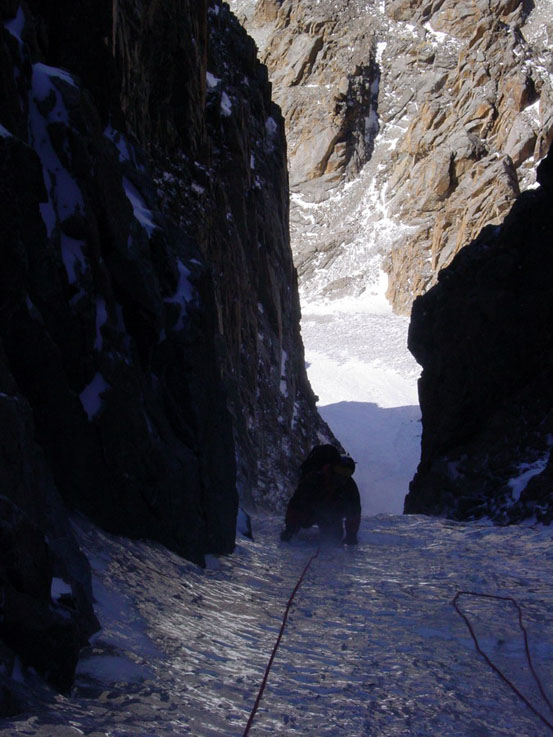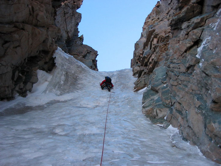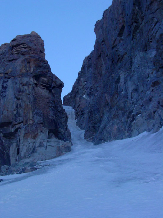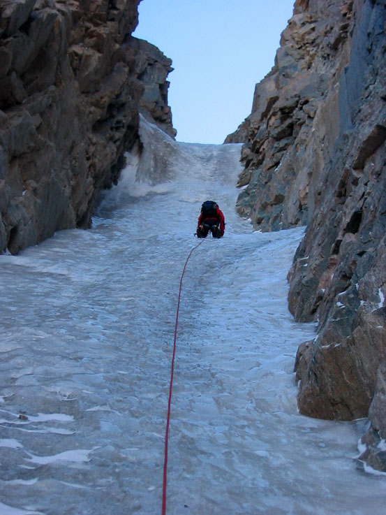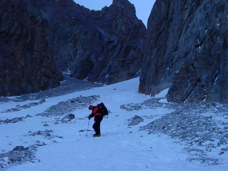 Так вот, Бача, как ее любя называют местные и не местные альпинисты, знаменита скальными бастионами, образующими западную часть горы. Монолитные скалы, щели, углы, карнизы – всем этим напичканы 400 метров скалы, отделяющей тропу от вершинного гребня. Между самым левым и средним бастионами есть глубокий крутой кулуар, куда, по-моему, солнце не попадает даже в самый солнечный летний день. Что уж говорить о зиме. Зимой там... Лед, ...и маршрут «Сопля».