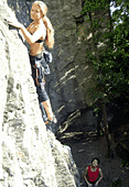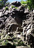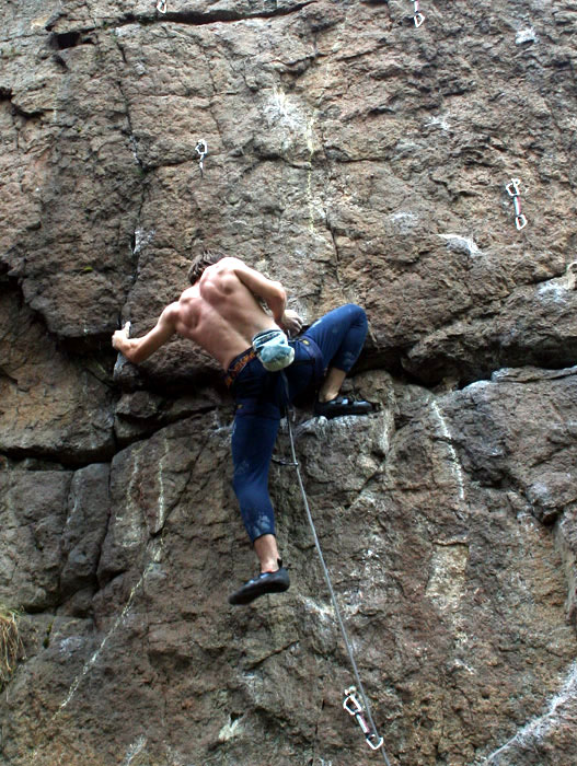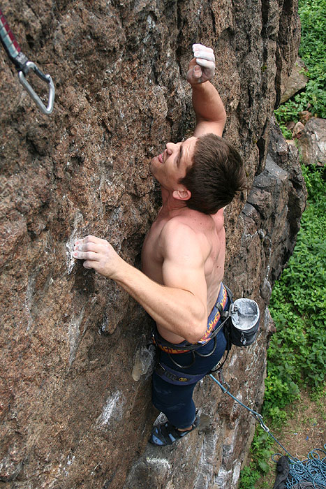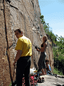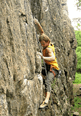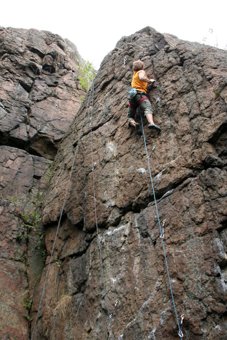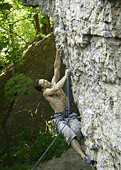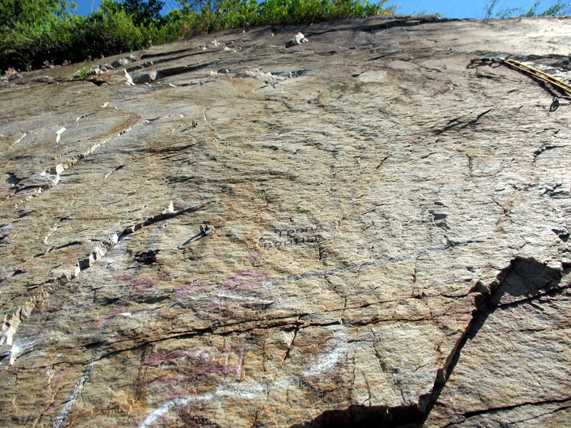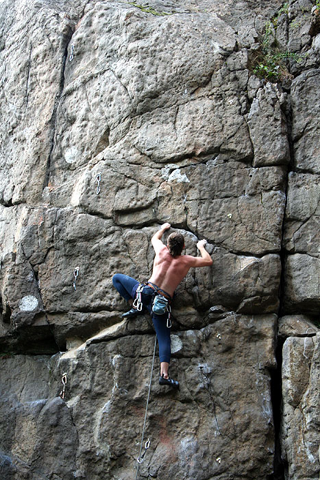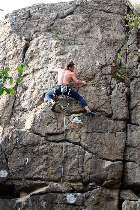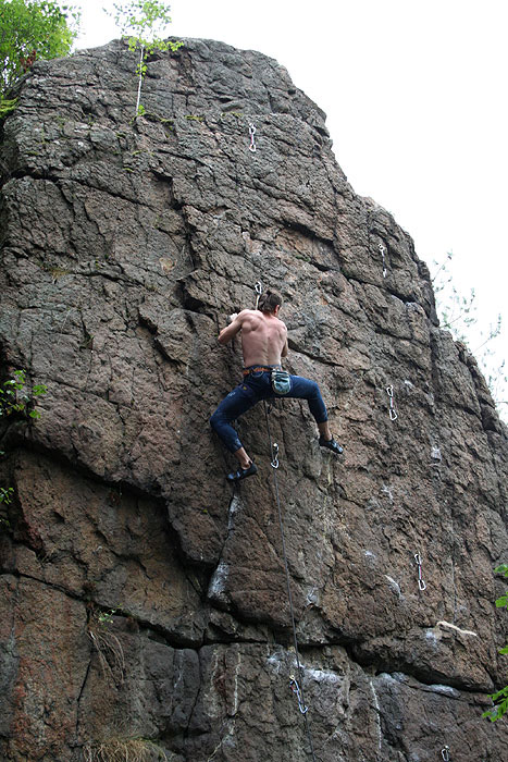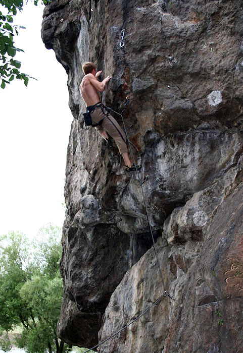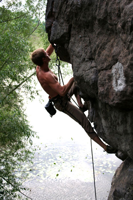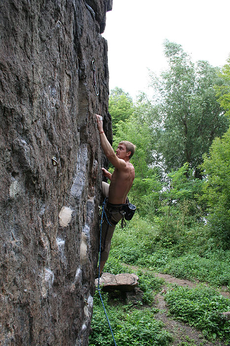 Нашим следующим пунктом назначения были воспетые в легендах и сказаниях Денеши. Места для костров и палаток здесь расположены прямо над скалами, в лесу. Внизу, под скальной грядой течет река Тетерев. Порода скал – гранит. Похоже, во время дождей сверху намывает землю, поэтому местами довольно грязно. Маршруты в основном, шестерки. Самый трудный маршрут района – 7а. Первые несколько метров лазания уровня не выше 6а, затем выход из-под карниза – несколько болдеринговых движений по жестоким мизерам, сделать которые нам не удалось. Складывается ощущение, что от района взято все, что можно. Более трудные трассы пробивать уже негде…