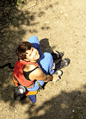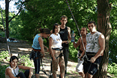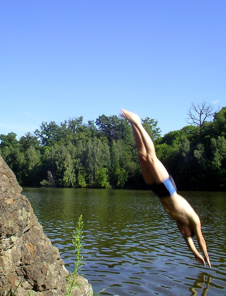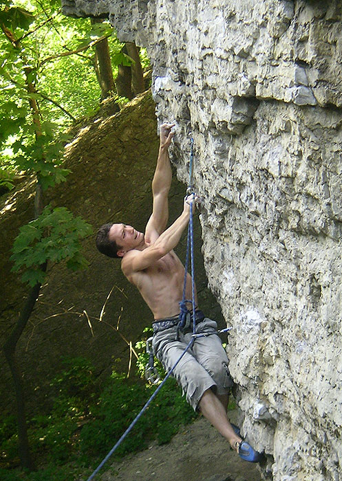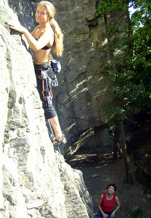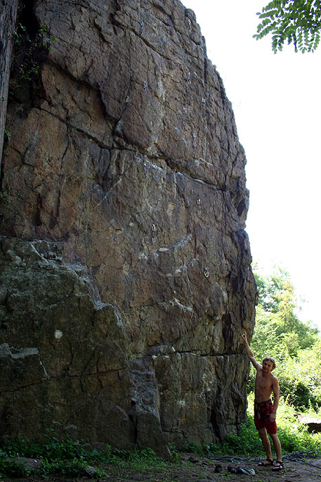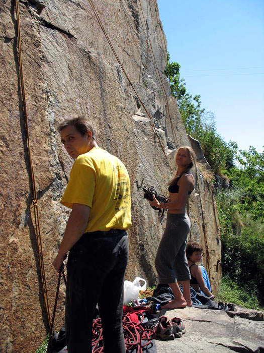 Перекусив дома у Тараса бутербродами с сыром, отменным салом и кофе, мы выехали в сторону Житомира. Нашей первой целью был Житомирский Архив. Это пыльное помещение, до потолка заваленное бумагами. У входа нас встретила бабушка в очках с толстыми стеклами… Шутка, шутка:) На самом деле, Архив - бывший гранитный карьер. Находится он прямо в городе. Приехав на место, мы обнаружили там группу удивленных детей на ковриках в нелепых позах, занимающихся йогой. Проезжаем мимо них в узкий проход между деревьями, ведущий к скале. Внезапно, раздается жестокий скрежет снизу и машина останавливается. Вылетаем из машины и лезем смотреть под днище. Видна трава и край желтой тряпочки. Со стороны детей доносятся вопли, что-то вроде «Бутерброды! Там была сумка с бутербродами!!» Мелькает мысль: «Черт побери, такими бутербродами и дно покорежить недолго!» Тарас сдает назад и аккуратно подминает сумку колесом. Немая сцена. Тарас сдает еще чуть-чуть и девочка-хозяйка наконец воссоединяется со своими бутербродами. Далее все как в мультике про Вини-пуха, когда улыбка медленно сползает с «лица» Иа… «Это он?.. Мой шарик?.. А какого цвета он был?..» Пришлось извиниться. А скрежетали все-таки не бутерброды, а огромный булыжник, который неудачно вывернулся из земли посередине дороги. Однако, на этом наше общение с пионерами не закончилось. Их вожатые – парни из Калифорнии – завесили для них верхнюю страховку практически на все трассы до второго болта. Все это дело приходилось аккуратно облезать и щелкаться в верхний карабин их оттяжки.