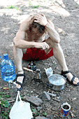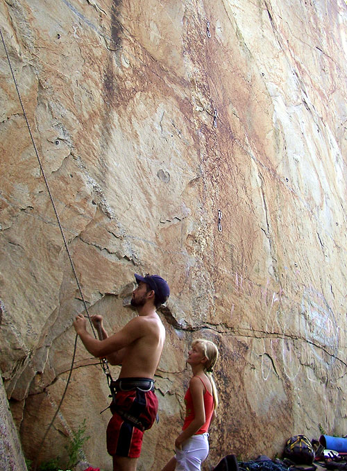 Ну, с утра как обычно – вылезаешь весь помятый из палатки, тело ноет от вчерашней разведки боем, пытаешься сообразить который час, потому, что часов ни у кого нет, а свои фик знает где, выпиваешь крепкий, по возможности, кофе (в этом выезде обнаружил, что очень удобно варить кофе на газовой горелке – можно сесть рядом и смотреть сверху как дышит варящийся кофе – с плитой в квартире такая тема не пройдет и думаешь, как бы избежать разминки. Но Сахо неумолимо строг, и кроме всяких там кручений частями тела, вдобавок устраивает еще и маленький курс растяжки. Ох… :))) Ну, и наконец лазать.