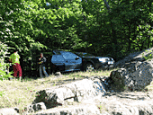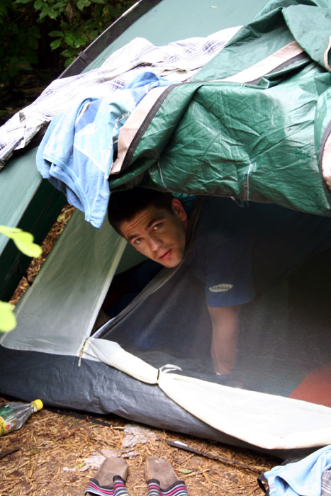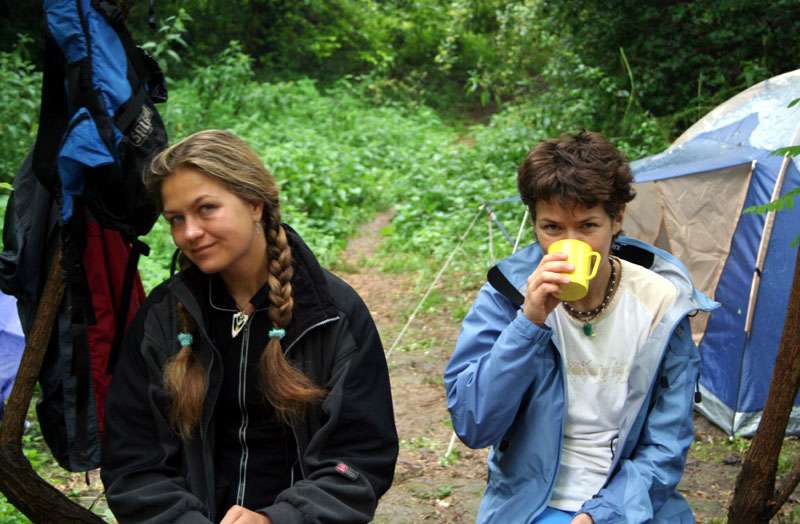 Пока ехали, погода испортилась. К тому времени, когда мы были в Соколинцах, уже шел сильный дождь. А гольф в такую погоду к скалам не подъедет. Все шло к тому, что топать нам до скал полчаса пешком. Тут хочется написать «Но, к счастью…». Однако, чуда не произошло. Вобщем, все вспомнили туристическое прошлое и вволю помесили грязь под дождиком. Спасибо Вано, помог донести лишний рюкзак, образовавшийся из-за растяжения Анч. Еще добрый Вано предложил быстро добежать и поставить нашу палатку, пока мы потихоньку ковыляем до лагеря. А моя палатка как раз хороша тем, что ее удобно ставить под дождем – сначала натягивается тент, потом к нему изнутри пристегивается сухая внутренняя часть с дном. Придя в лагерь, я обнаруживаю, что Вано и Сахо, пристегивают насквозь мокрую внутреннюю палатку, в которой вода чуть ли не плещется (дно-то не протекает, в отличие от верха). «А мы тут не сразу сообразили чё куда…» Сам виноват, надо было рассказать, чё куда. :)