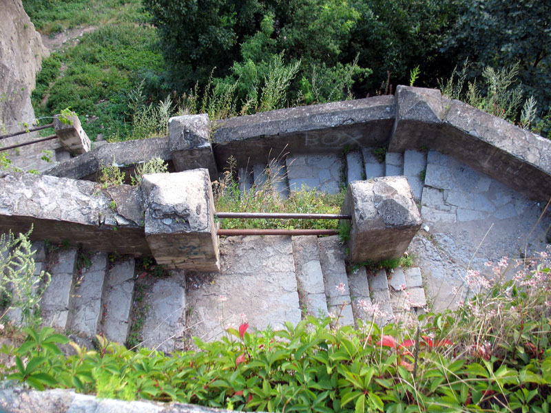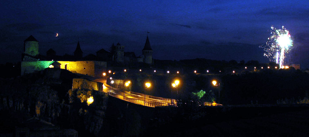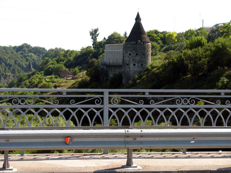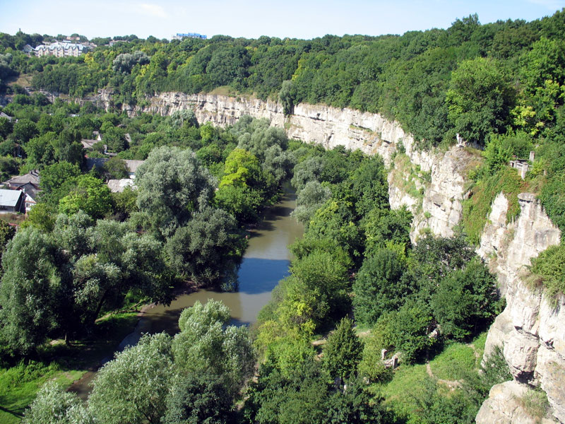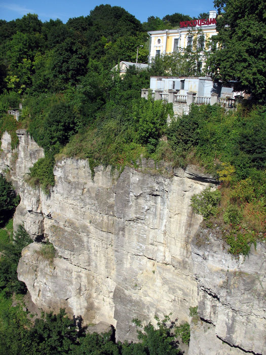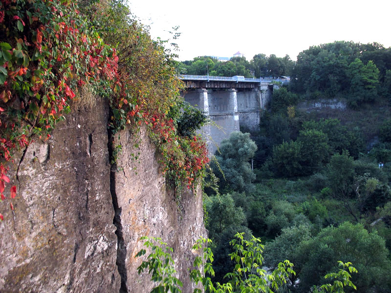 В Денешах мы переночевали и наутро выдвинулись в Каменец-Подольский. Приехав, поселились в гостинице «Украина» (60 гривен за 2-местный номер с удобствами на этаже), совсем рядом со скалами. Город пресекает глубокий (несколько десятков метров) каньон. Маршруты, которые мы успели попробовать, пробиты в районе моста на старый город. Спуститься к началу маршрутов можно по каменной лестнице в стене каньона.