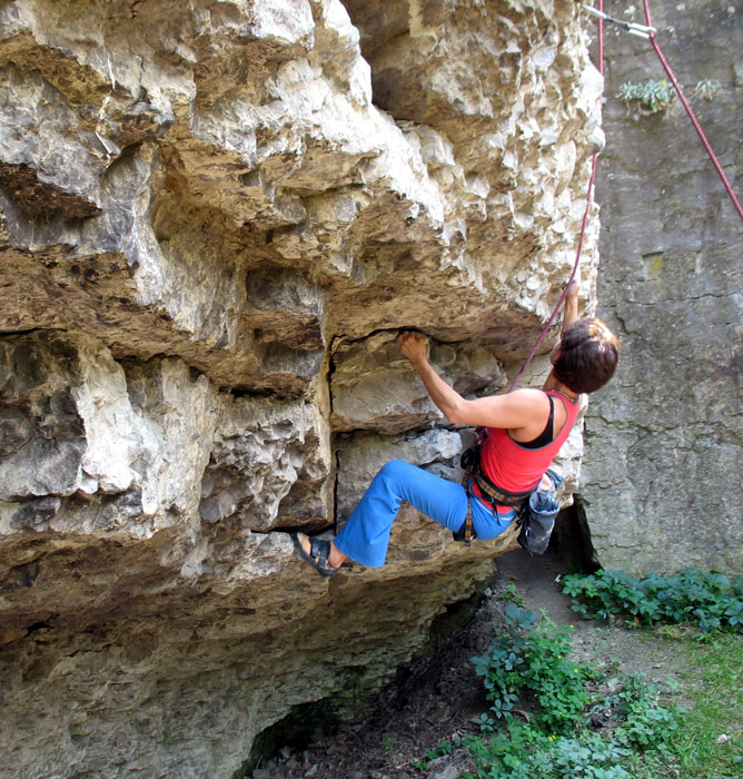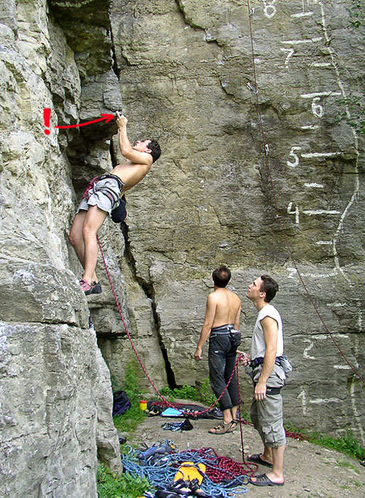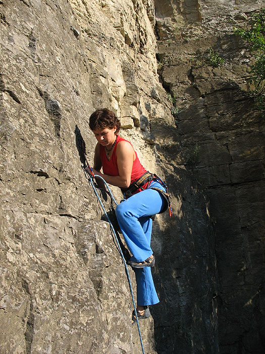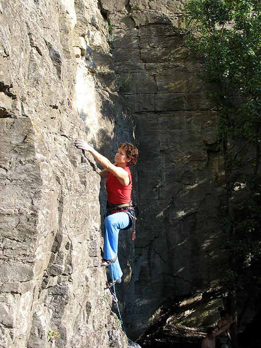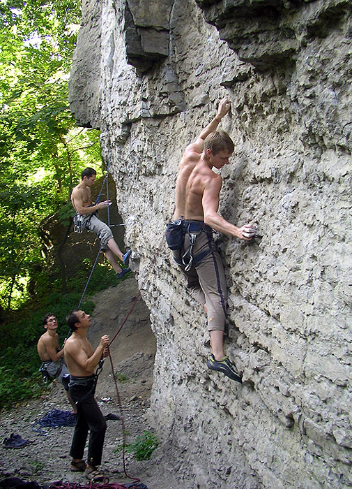 Массу разнообразных эмоций принес маршрут «Облога», 6с. В ключе необходимо выйти левой рукой на находящийся сверху подхват-откидку, держась в блоке правой за горизонтальную полочку-мизер. Пальцы стреляли с нее… Ну, примерно как застежка в фильме «Бриллиантовая Рука». Причем совершенно без предупреждения. Еще был забавный короткий маршрут Годзiла. Тоже заставил изрядно поднапрячься, прежде чем нашелся правильный расклад. Вообще лазания не в раскладе каменецкие маршруты не прощают. Вечером в субботу мы вместе с Михаем и Серегами навестили живописное заведение «Пiд Брамою».