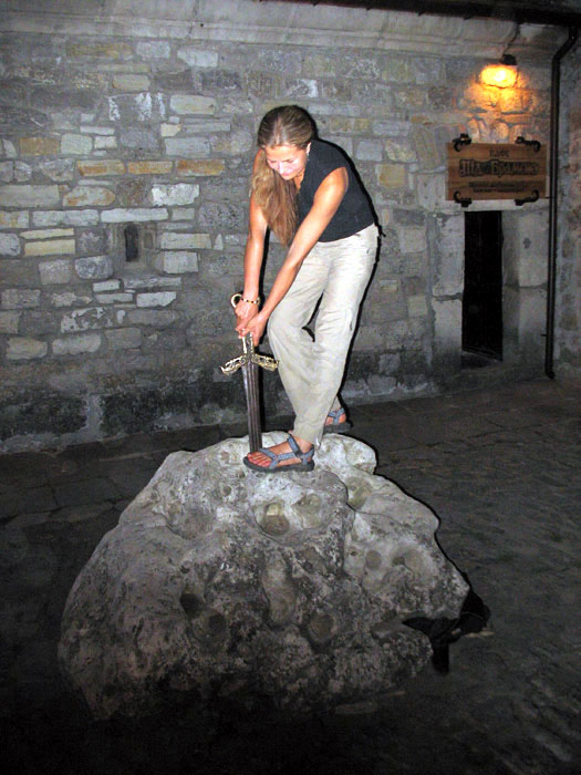 Хотя сейчас там и подают пиво, но внешне это место больше напоминает музей. Здание очень старое. Старинная каменная кладка свидетельствует о том, что когда-то оно было частью крепостных укреплений. По стенам висит старинное оружие. В укромном внутреннем дворике расположен легендарный камень, в который, отходя от дел, уже пожилой король Артур воткнул свой Экскалибур. С открытой веранды, где мы сидели, открывается отличный вид на старую фортецию, где в тот вечер как раз давали салют.