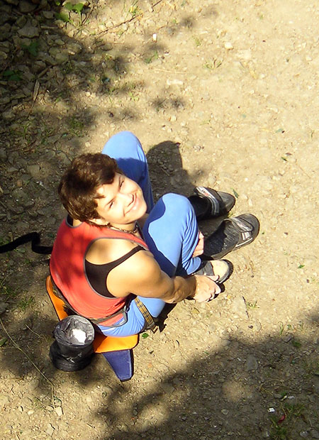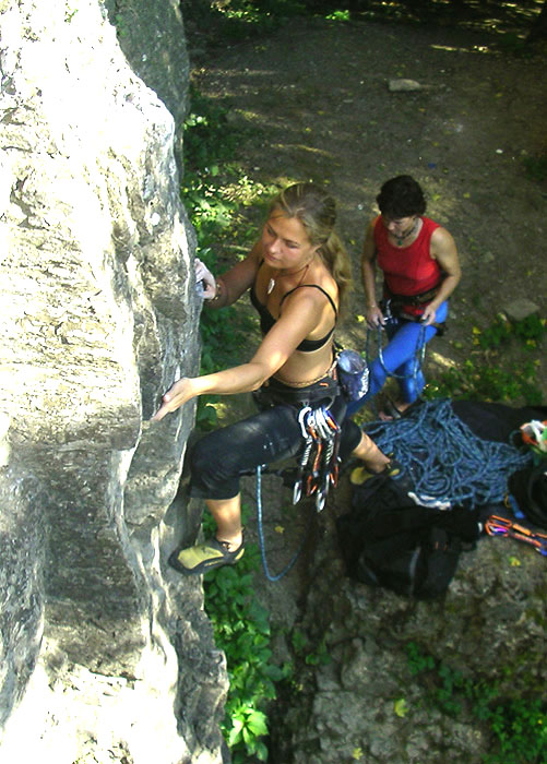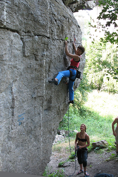 Наутро мы еще полазили в Каменце и двинулись дальше. Было воскресенье, Тарасу пришло время ехать домой, в Киев, а нам нужно было попасть на скалы Звонихи, где нас уже ждали Вано и Сахо. В это время Анчутка обнаружила у себя растяжение голеностопа (Предположительно, подвернула ногу, когда лазила по балкону. Не в смысле ночью за пивом, просто маршрут так называется.) Нога «распухла и мешала ходить». Перед обедом мы выехали из Каменца в Винницу. На месте были часам к пяти и, перекусив, продолжили путь в Звониху.