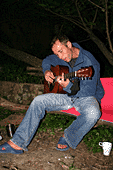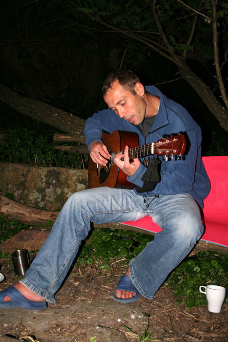 Чуть позже к нам с Сахо присоединилась компания киевлян – очень душевные ребята, безусловно, фанаты, поскольку ехать из Киева очень, очень далеко менее чем на сутки, чтоб полазить – это надо быть фанатом. Вечером запалили костер, выпили за знакомство, да и за все хорошее бутылочку вина и энное количество бутылок пива, послушали чудную игру на гитаре и… И все, неудержимо уже тянуло в сон – бороться с Морфеем почти бесполезное занятие, особенно когда вокруг уютно, ты немного пьян и всю ночь до этого пытался заснуть в поезде.